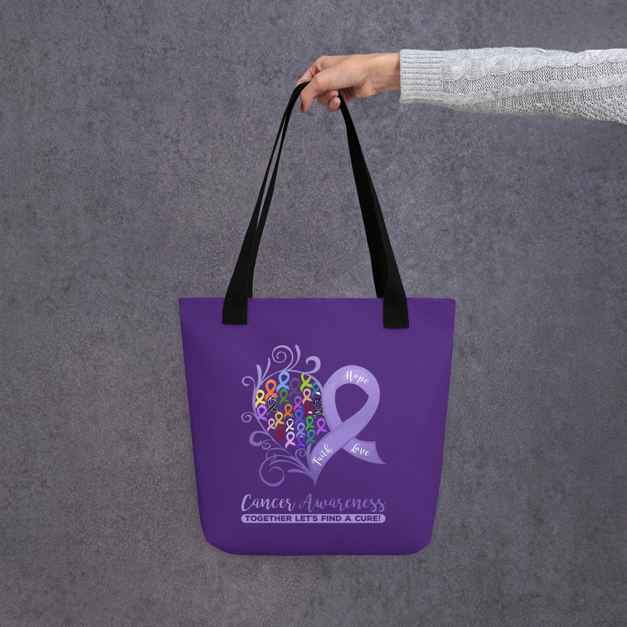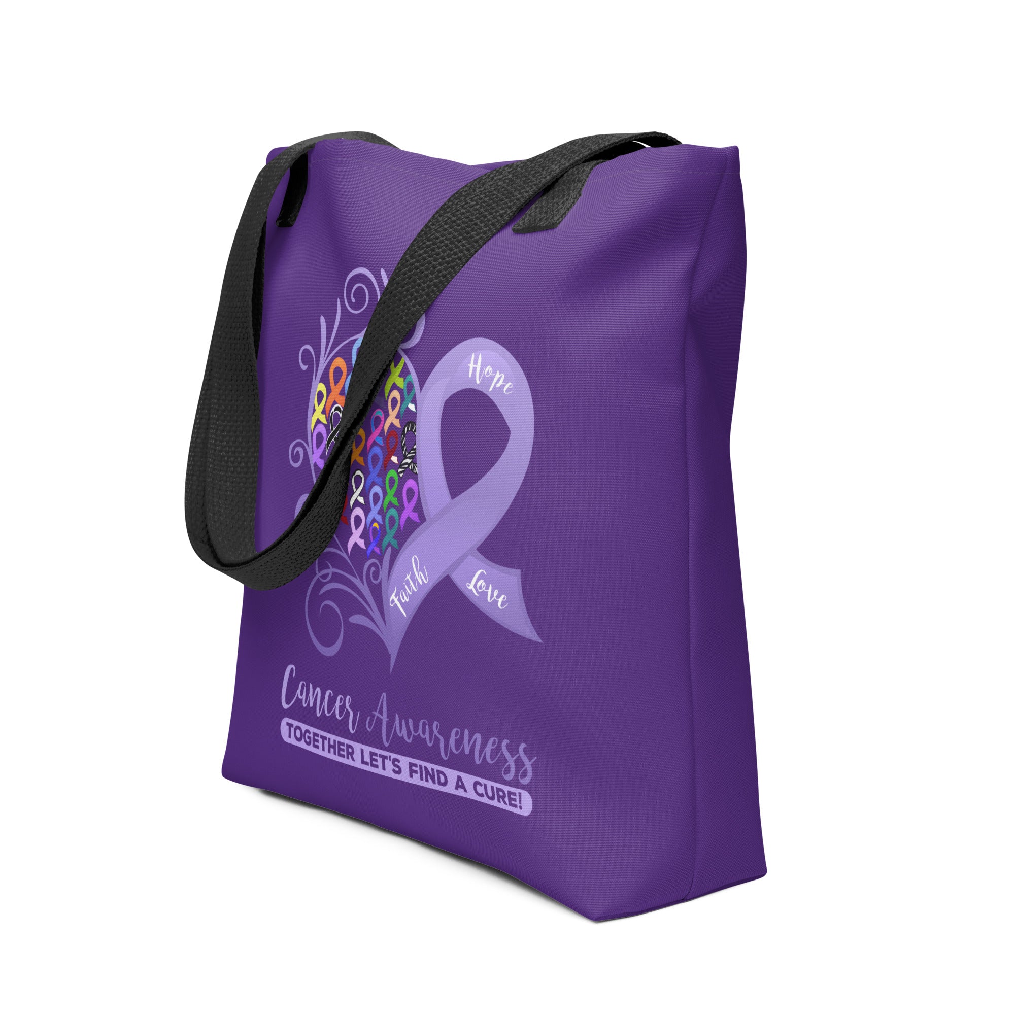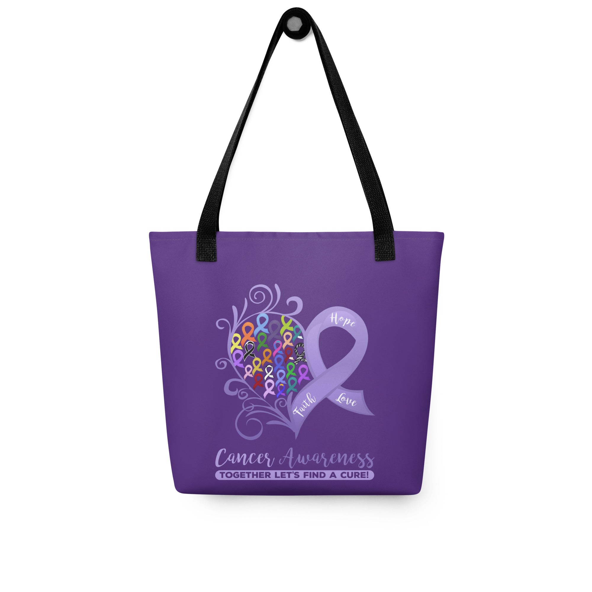 As an ovarian cancer survivor who was diagnosed at the age of 40, I created this all cancer heart design to promote awareness for all types of cancer. Together let's all work together to end this disease. A spacious and trendy tote bag to help you carry around everything that matters.
