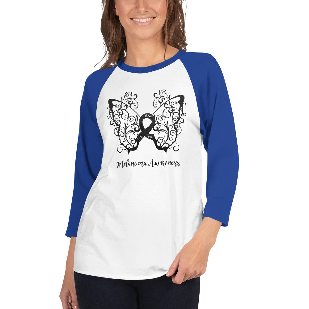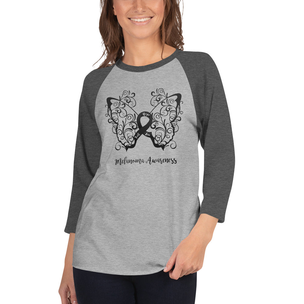 Melanoma Awareness Filigree Butterfly 3/4 Sleeve Raglan Shirt